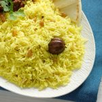 -Add rice,raisins,cinnamon sticks,dried lemon,saffron strands,cloves,green cardamoms,black peppercorns,bay leaves,turmeric powder,pink salt & mix well on medium flame for 2-3 minutes.