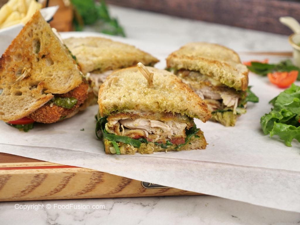 -On bread slice,add & spread prepared pesto sauce,add baby spinach,tomato slices,cheddar & mozzarella cheese,chicken fillet,cheddar & mozzarella cheese,pesto sauce & cover with another bread slice & grill for a minute until cheese melts (makes 3).