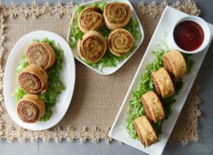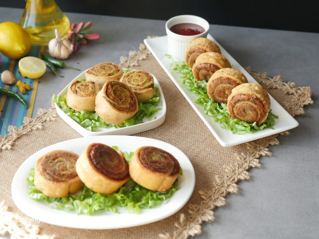 Dough ko roll ker lein aur pin wheel slices mein cut ker lein (not more than 1 inch) (makes 24-25).