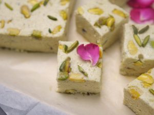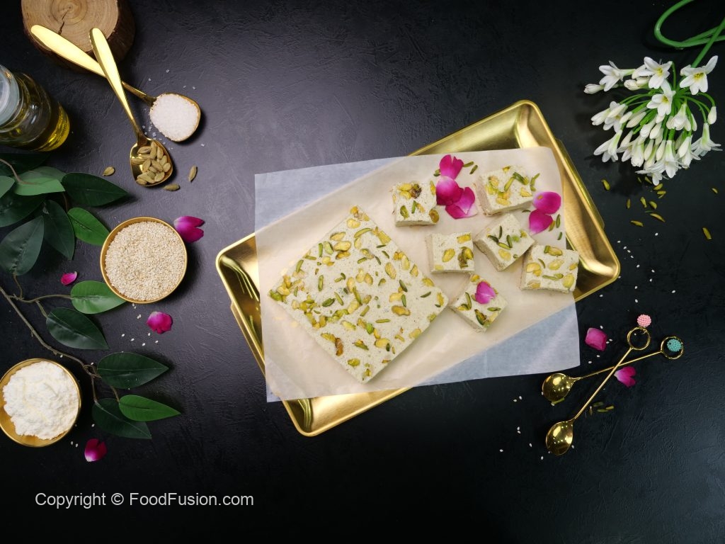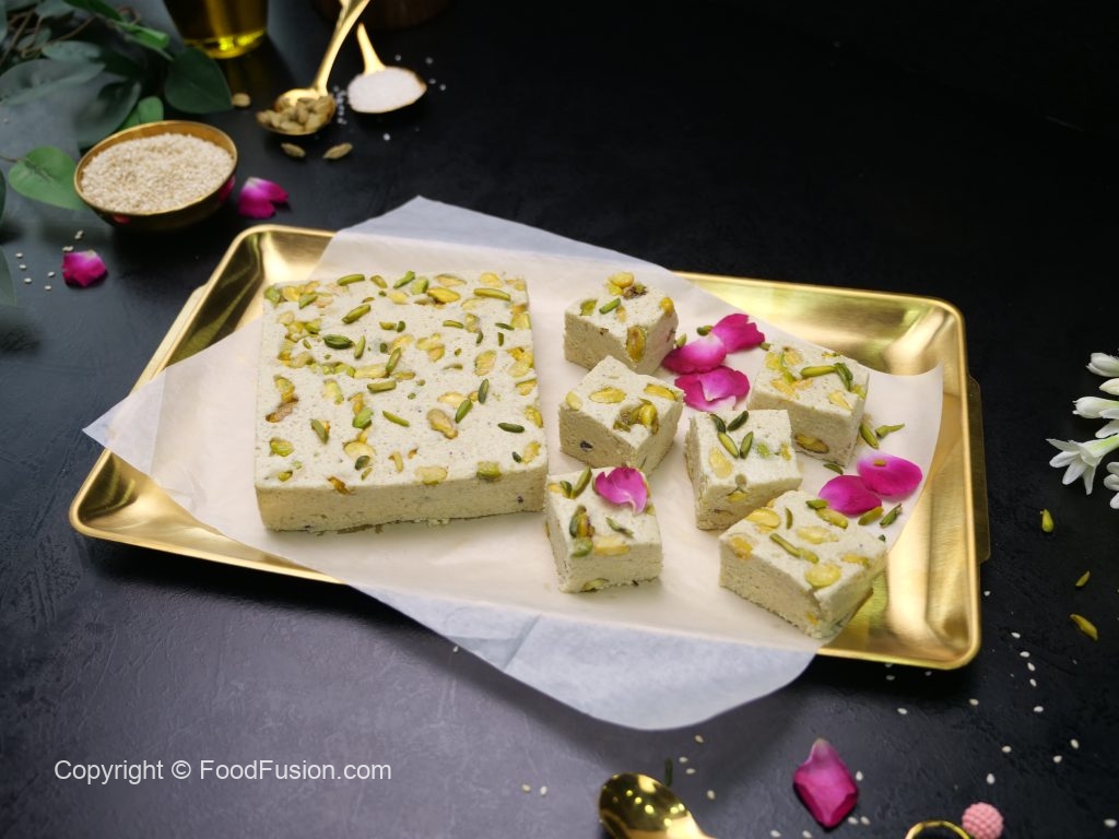 -Grease mold with cooking oil (lined with cling film),add pistachios,sesame seeds mixture,spread evenly & add pistachios in between & let it set in refrigerator for 2-3 hours.