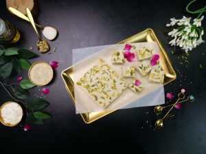 -Take out in a bowl,add sugar,cardamom powder,milk powder,rose water & mix until well combined.