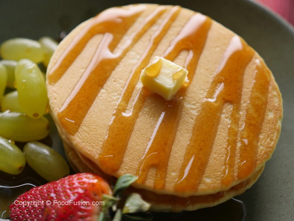 Grease frying pan with butter and pour ¼ cup & 1 tbs of prepared batter and cook on low flame from both sides until done (Flip when bubbles rise on the surface approx. 1 minute each side) makes 4 large & 10 small pancakes.