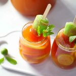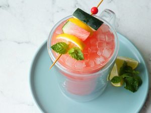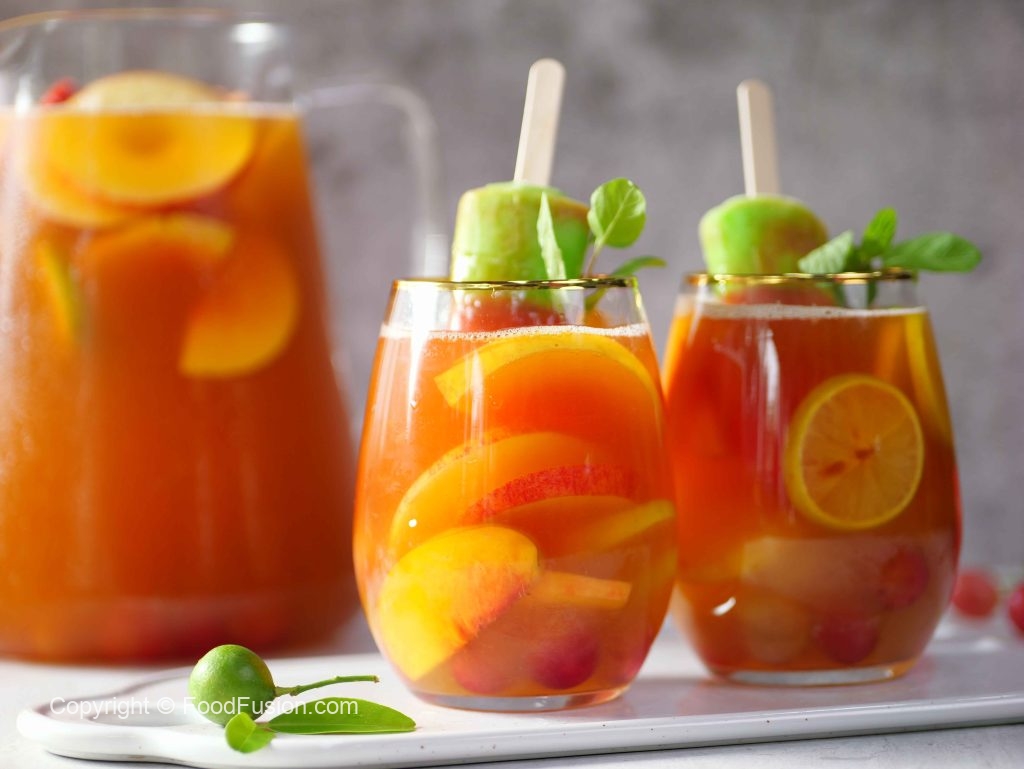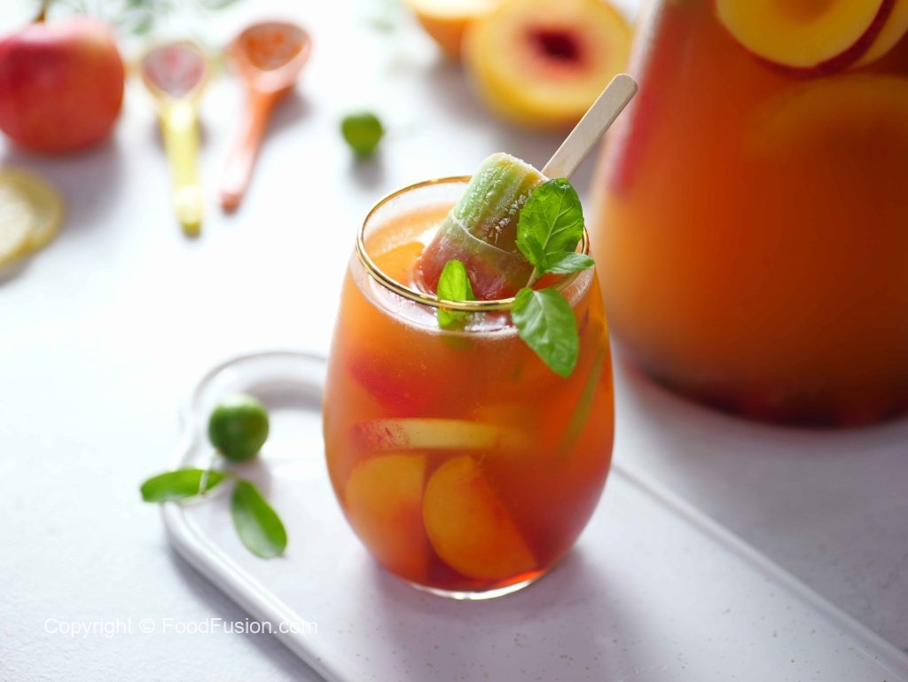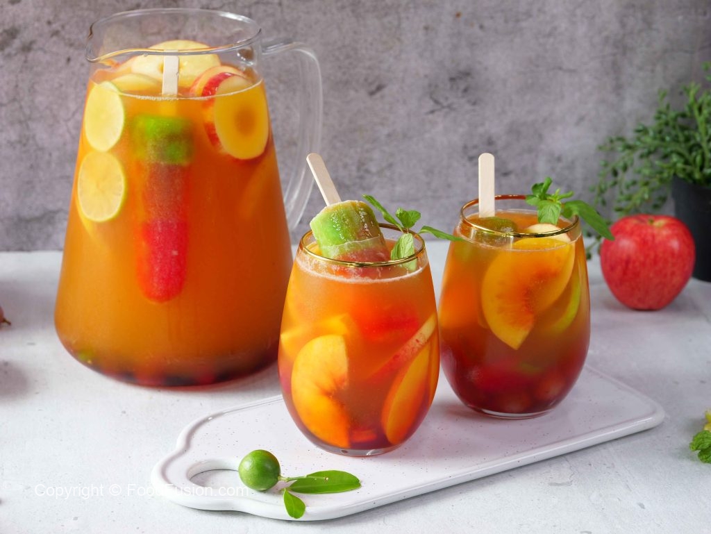 -Ab ek jug mein ice cubes, prepared lemonade, peach, red grapes, apple, lemon, orange juice, pineapple juice, sparkling water aur omore traffic light daal kar mix karen.