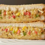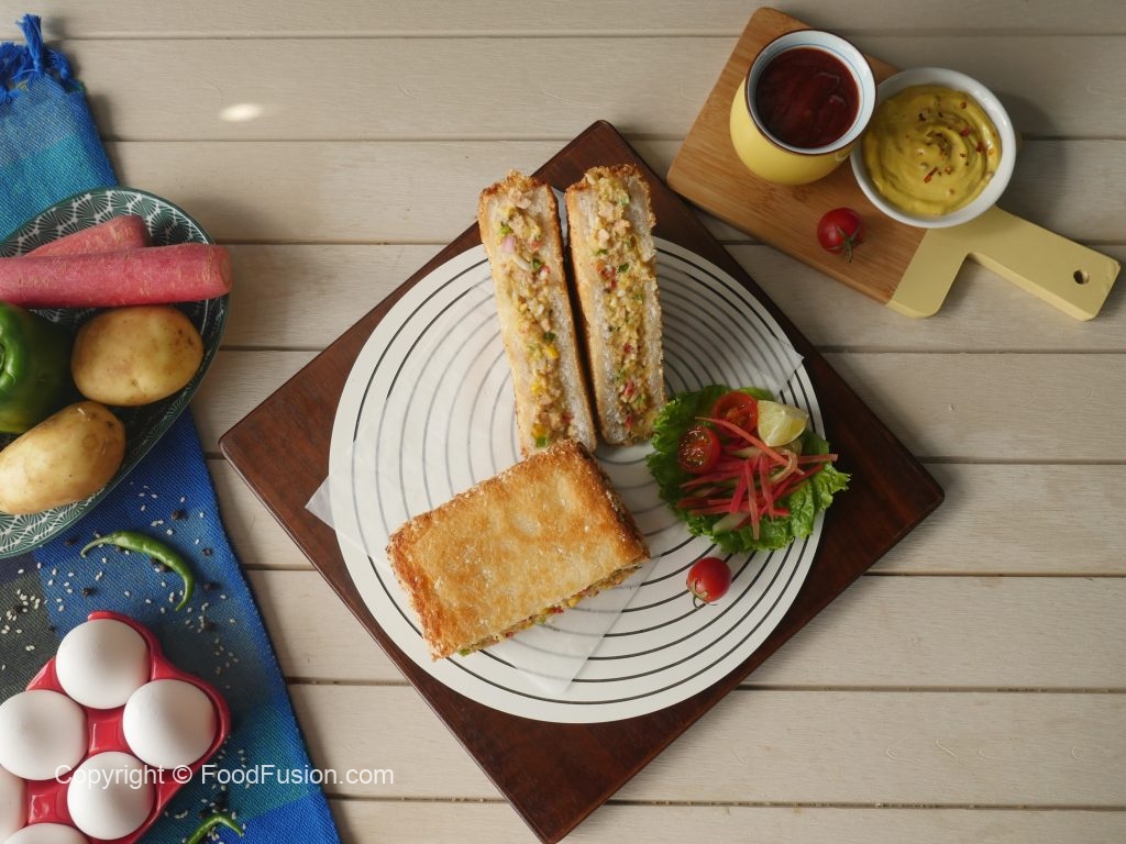 On a bread slice,place prepared ball & spread mixture evenly and place another bread slice over it then dip into prepared flour slurry & coat with breadcrumbs & shape the sandwich properly (makes 7-8).