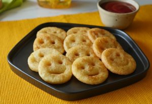 In wok,add corn oil,heat it and fry potato smileys on medium flame until golden brown.