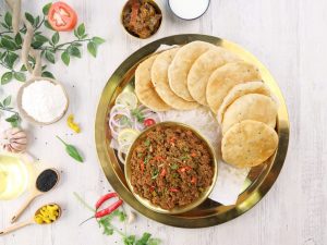 -In a wok,add beef mince,onion,tomatoes,ginger garlic paste,green chilli paste,yogurt,turmeric powder,salt,kashmiri red chilli powder,red chilli powder,garam masala powder,mix well & marinate for 15 minutes.