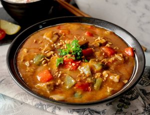 Garnish with reserved fried garlic,green onion leaves & serve with boiled rice.