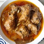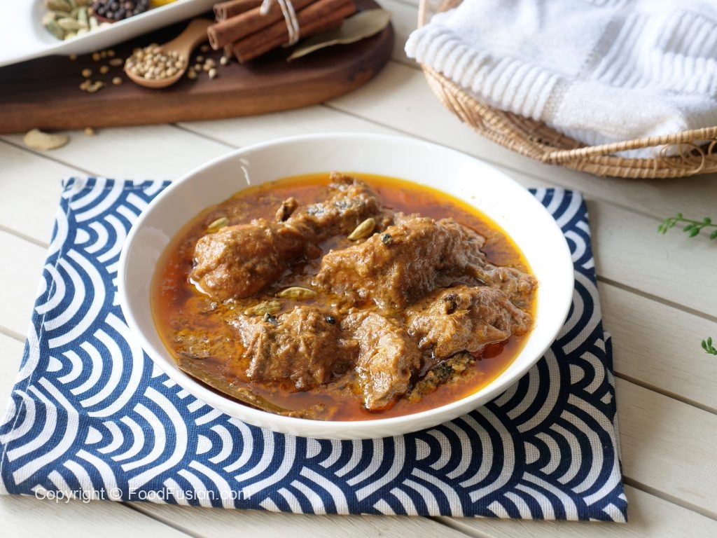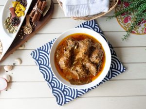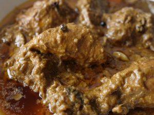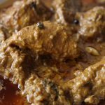 Add yogurt,ginger,garlic,black peppercorns,mace,green cardamom,cloves,cinnamon sticks,bay leaves, cumin seeds,red chilli powder,turmeric powder,salt,fried onion (crush with the help of hand),cashew paste & mix well.