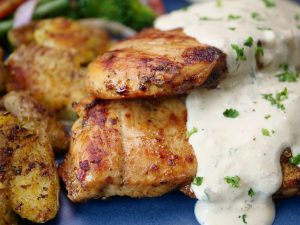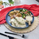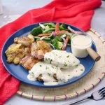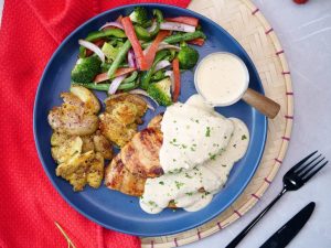 -On a serving dish,add prepared sauteed vegetables,crispy smashed potatoes,chicken steak & pour prepared tarragon sauce,fresh parsley & serve!