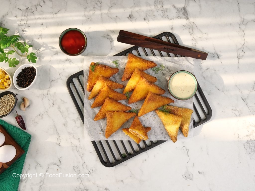 -On a cutting board add bread slices cut corners use bread trims to make bread crumbs. Set aside.