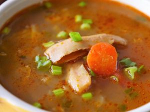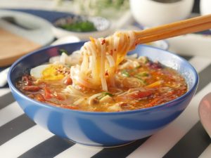 -Serving bowl mein ramen noodles, carrot, chicken slices, soy sauce eggs, reserved chicken broth, spring onion aur spring onion leaves dal kar serve karein!