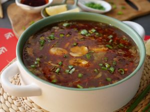-Ek bowl mein water, sugar, dark soy sauce, vinegar aur soy sauce dal kar mix karein.