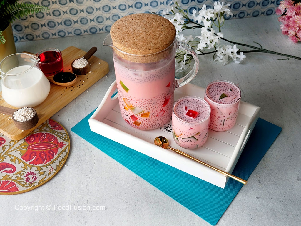 Jug mein ice cubes,colored jelly cubes,cooked sabudana,soaked tukhme balanga & tayyar doodh dal ker ache tarhan mix ker lein & serve karein!