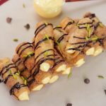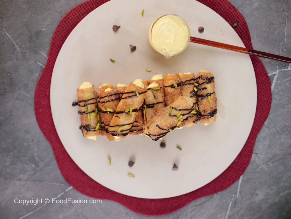 -Pipe out prepared creamy custard in the cinnamon sugar-coated samosa rolls.