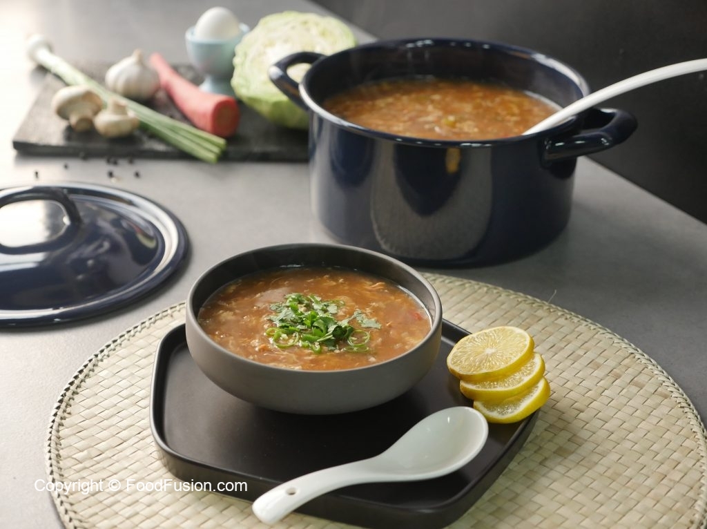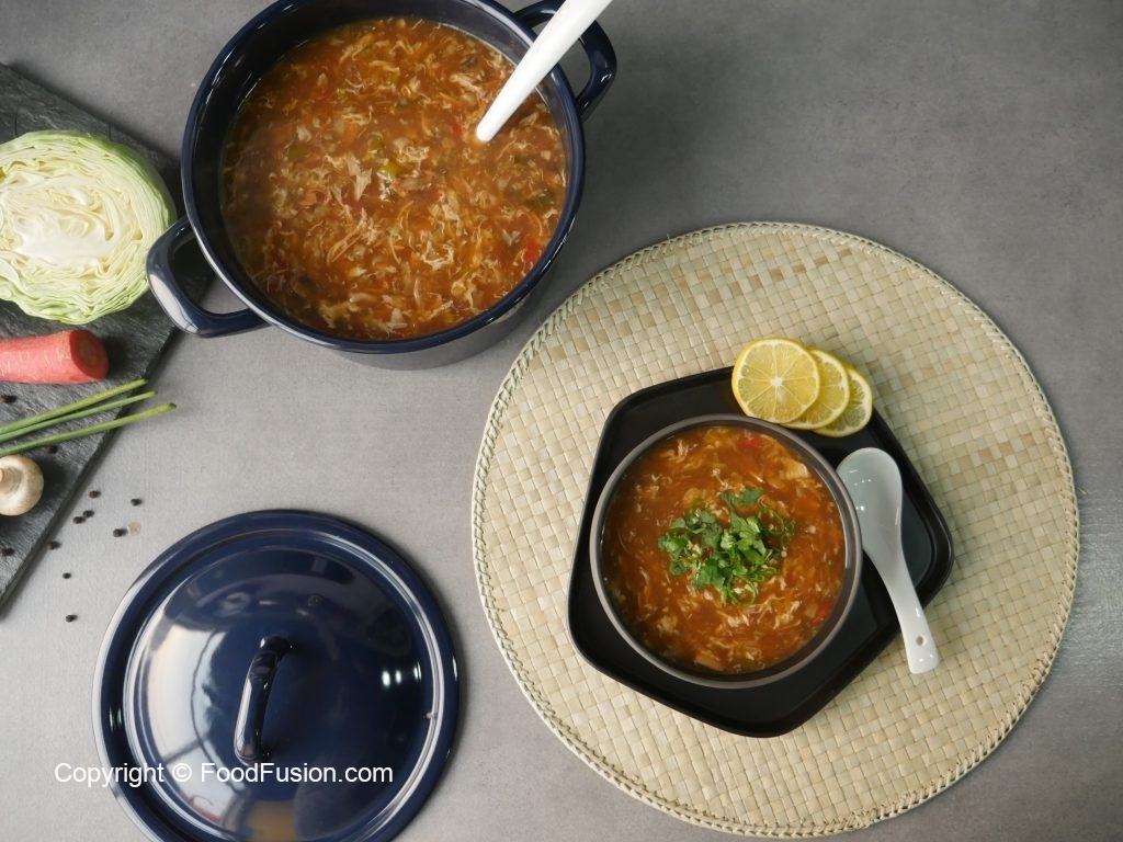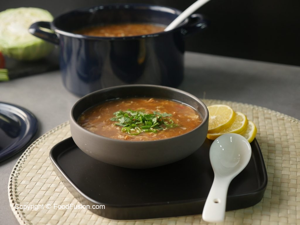 Add prepared chicken stock,carrot,shredded chicken,soy sauce,hot sauce,vinegar,black pepper powder, salt,sugar,tomato ketchup,cabbage,mix well and bring it to boil,cover and cook on low flame for 5-8 minutes.