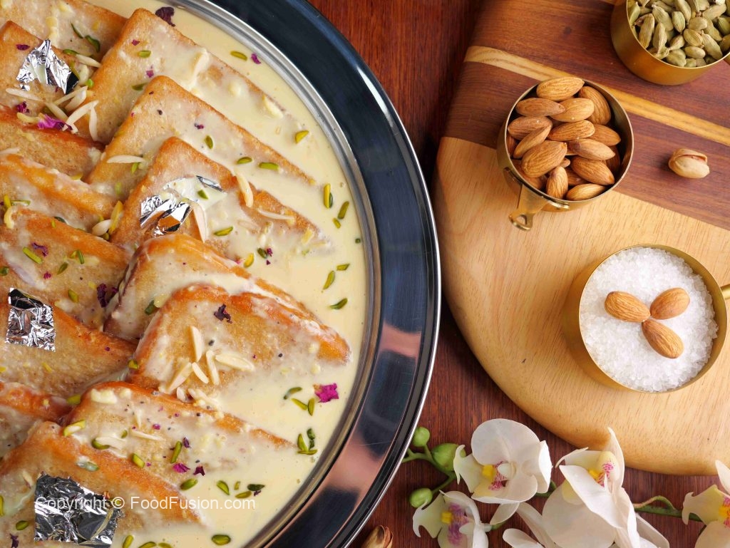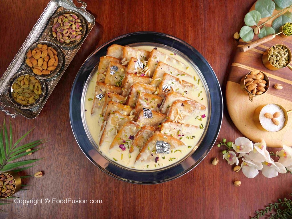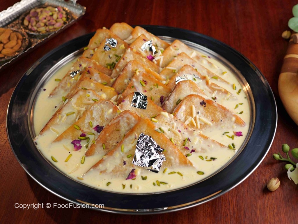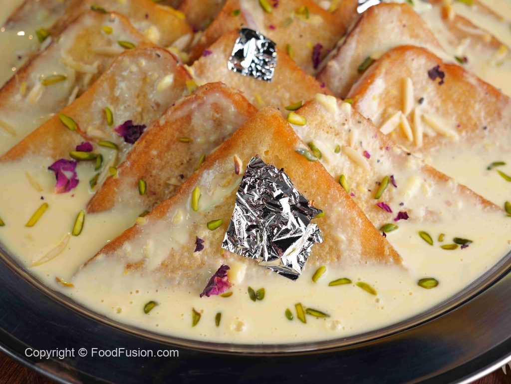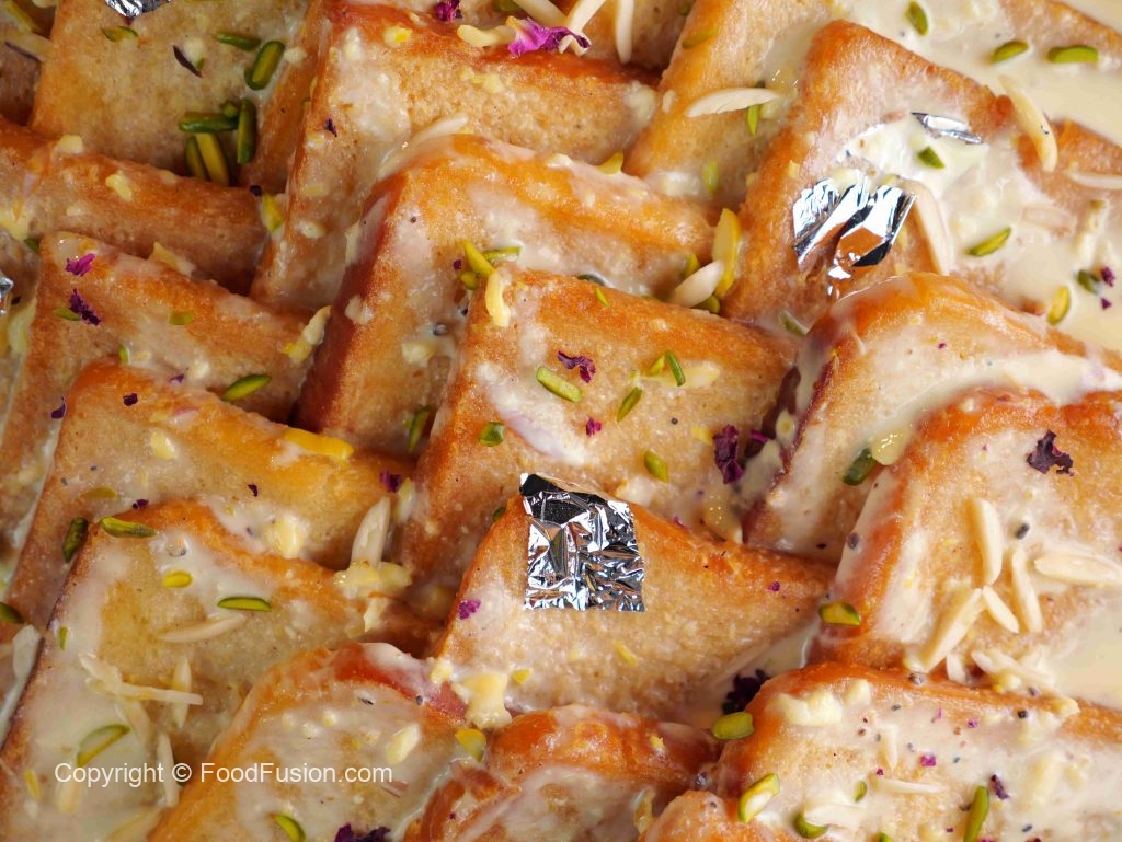 -Dip fried bread slices in prepared warm sugar syrup & place them in a serving dish, pour prepared custard milk, garnish with pistachios, almonds, & silver leaf & serve!