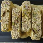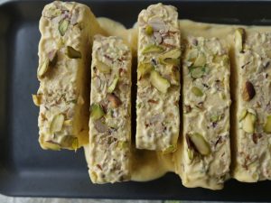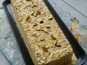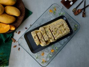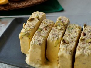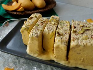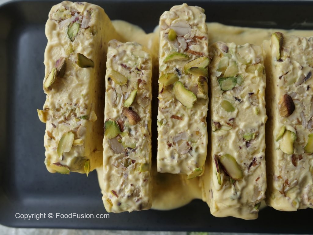 In an ice cream mold,sprinkle pistachios,almonds and add prepared mangi kulfa ice cream mixture, cover with cling film and freeze for 8 hours or overnight.