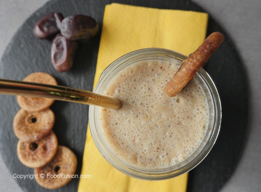 In jug,add figs,dates (deseeded) and milk,mix and soak for 4 hours or overnight in refrigerator.