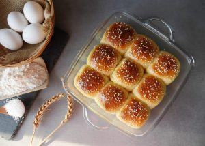 On the top of the buns,apply whisked egg and sprinkle sesame seed.