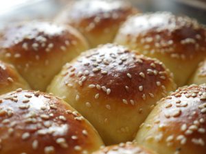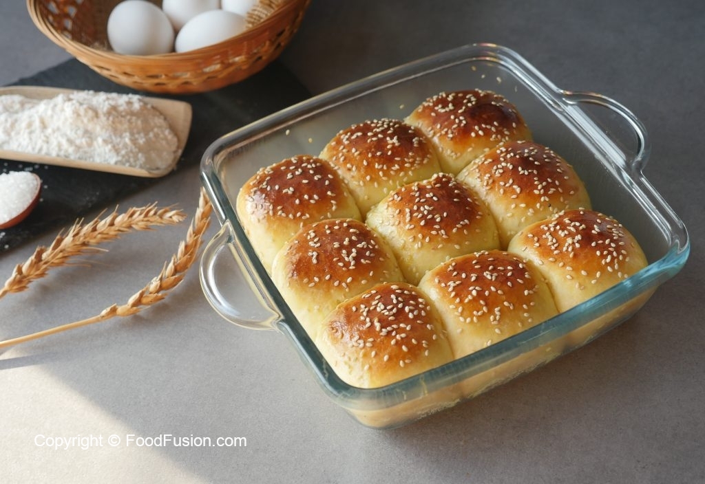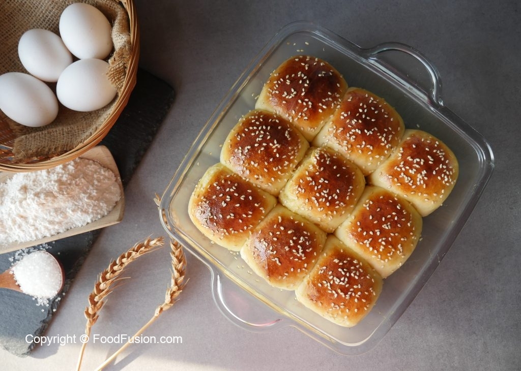 Buns ka upper whisked anda laga ker safed til sprinkle ker lein.