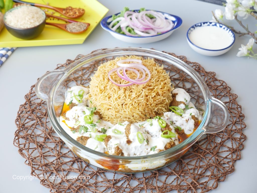 On serving dish,add prepared pulao,kabab with gravy and yogurt.