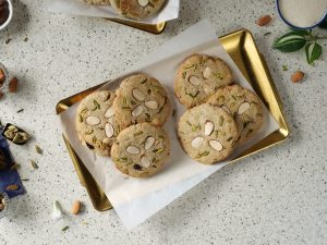 -Add sugar,poppy seeds,desiccated coconut,cardamom powder,baking soda,pink salt,clarified butter, kewra essence & mix well.