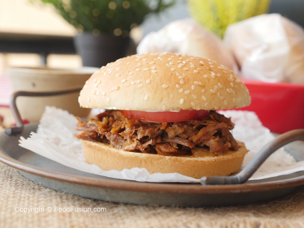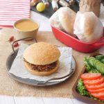 On burger bun,add & spread special mustard sauce,beef mixture,special mustard sauce,tomato and cucumber.