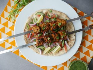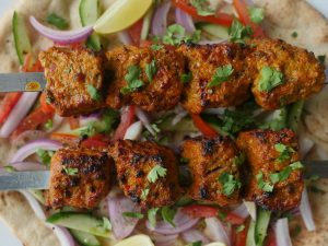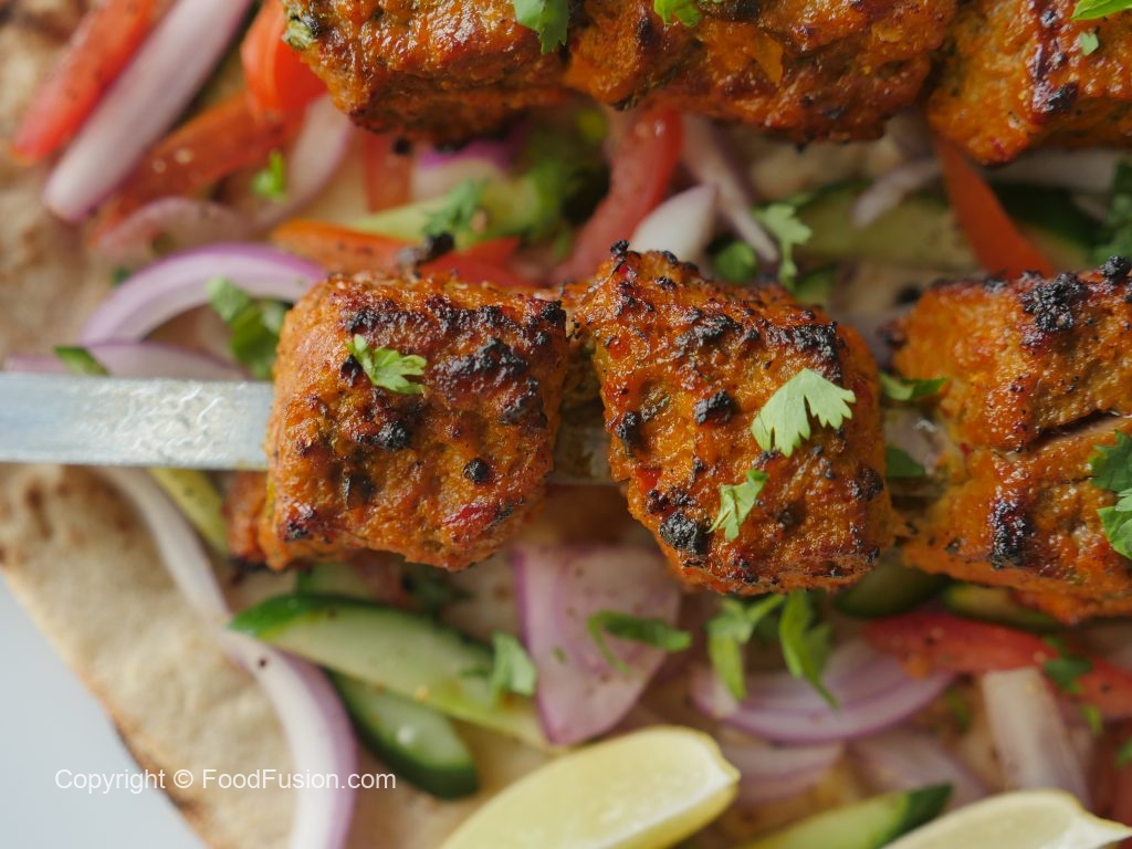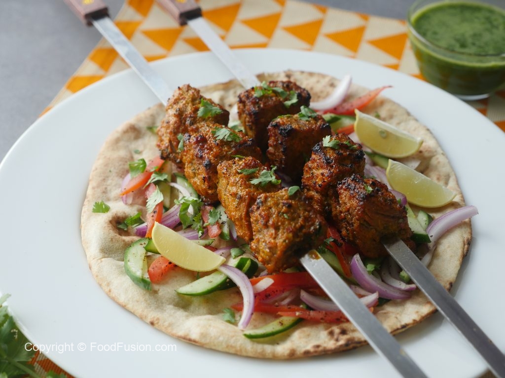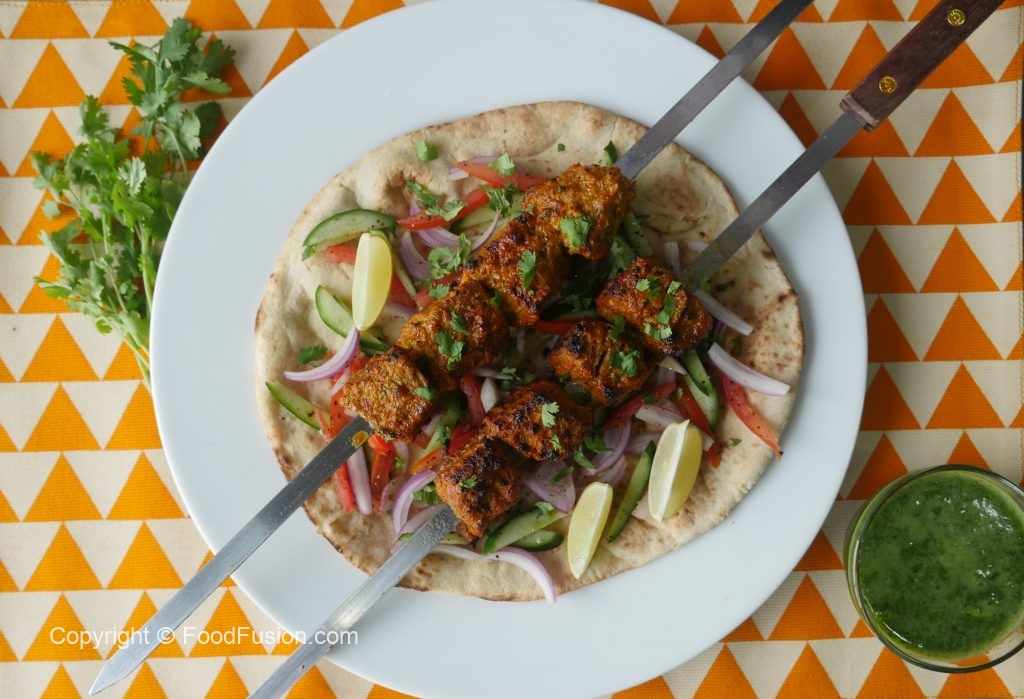 -Skewers ko (jaltay hoye koyla) bbq grill per tamam sides sa grill ker lein aur oil basting ker lein.