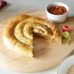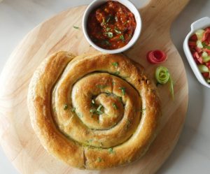 Grease baking tray with melted butter,make a spiral shape of rolled paratha & join both rolled parathas together,pinch and seal the end tightly and fold underneath and apply melted butter with the help of the brush.