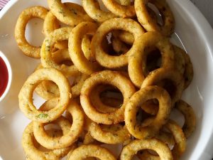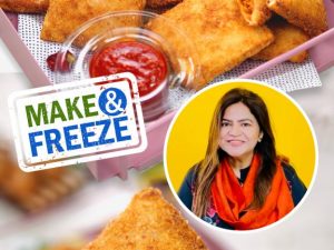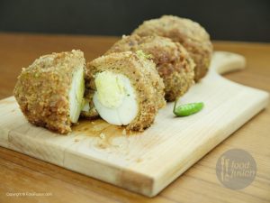 Now dip into beaten eggs and coat with breadcrumbs then again dip into beaten eggs and coat with breadcrumbs (makes 6).