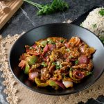 In a bowl,add beef,soy sauce,lemon juice,vinegar,ginger garlic paste,sriracha sauce,black pepper powder,salt and mix well.