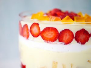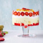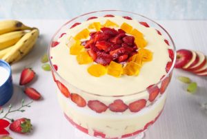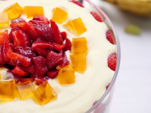 -Trifle bowl mein red jelly cubes,plain cake cubes,sugar syrup,tayyar custard,whipped cream,tayyar mixed fruits aur sugar coated strawberries dal ker bowl ki sides ker strawberry slices laga lein.