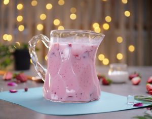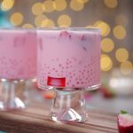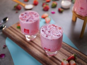 -In a jug,add red jelly cubes,coconut jelly cubes,cooked tapioca sago,srawberry chunks,ice cubes, prepared milk & stir well.