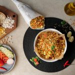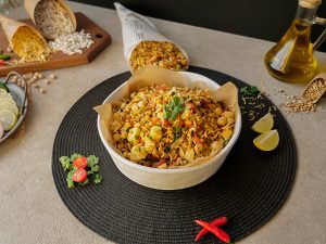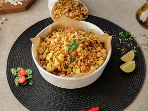 In a bowl,add roasted puffed rice,cucumber,onion,chickpeas,tomato,potato,green chilli,ginger,nimco mix,pickled oil,prepared spice mix,fresh coriander,lemon juice & mix well.