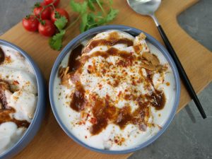 -In a serving bowl,add prepared dahi baray & break them with spoon.