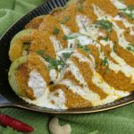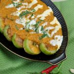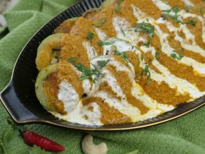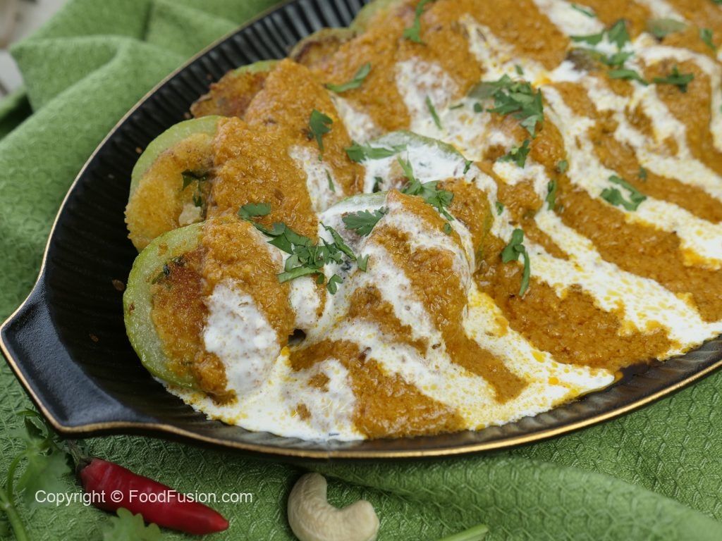 In a serving dish,place fried stuffed bottle gourd slices and pour prepared gravy on top.