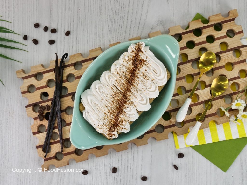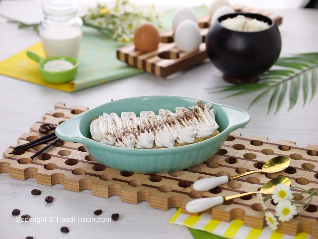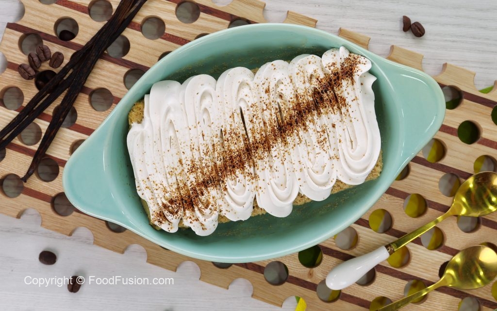 -In serving dish,place cake piece & pour prepared milk mixture on cake,garnish with whipped cream, coffee powder & serve chilled!