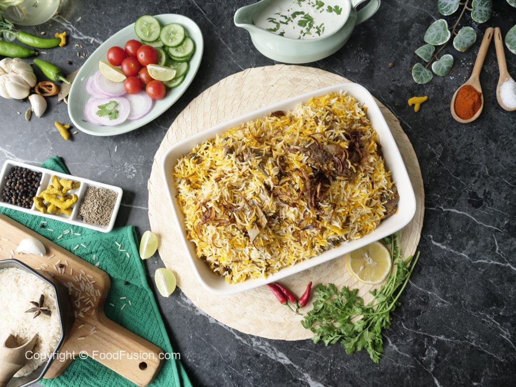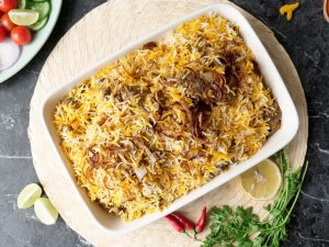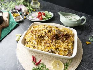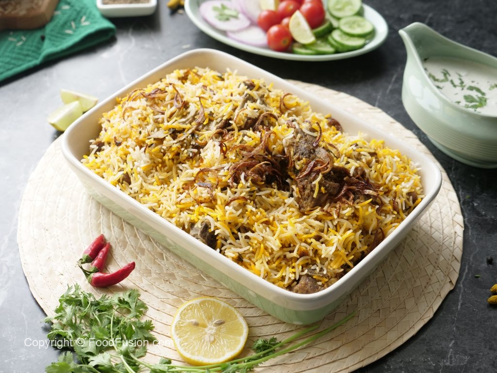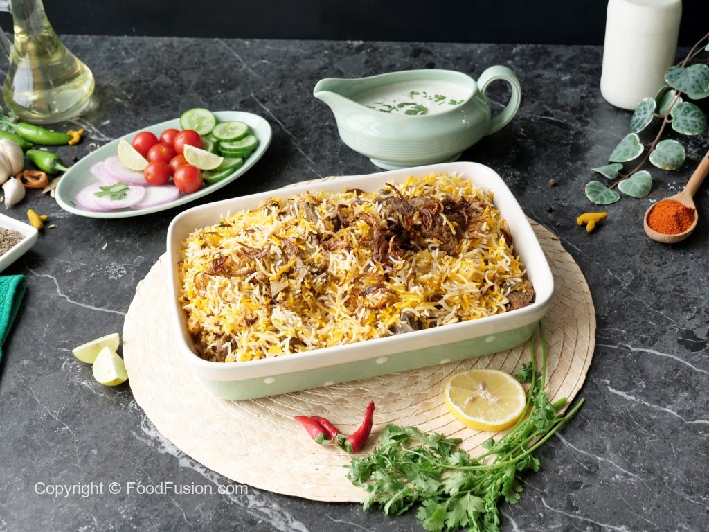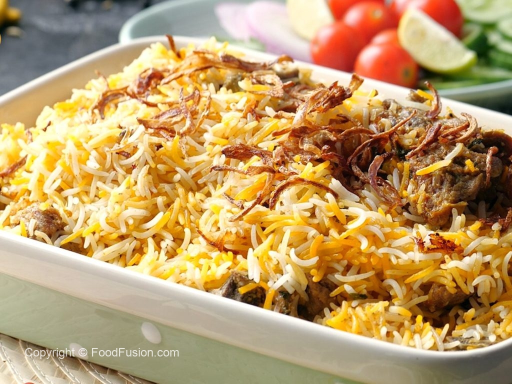 Fried pyaz sa garnish ker lein,salad & raita ka saath serve karein.