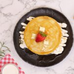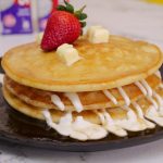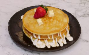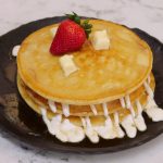 -Drizzle cream in between pancakes,add butter,drizzle maple syrup & serve!