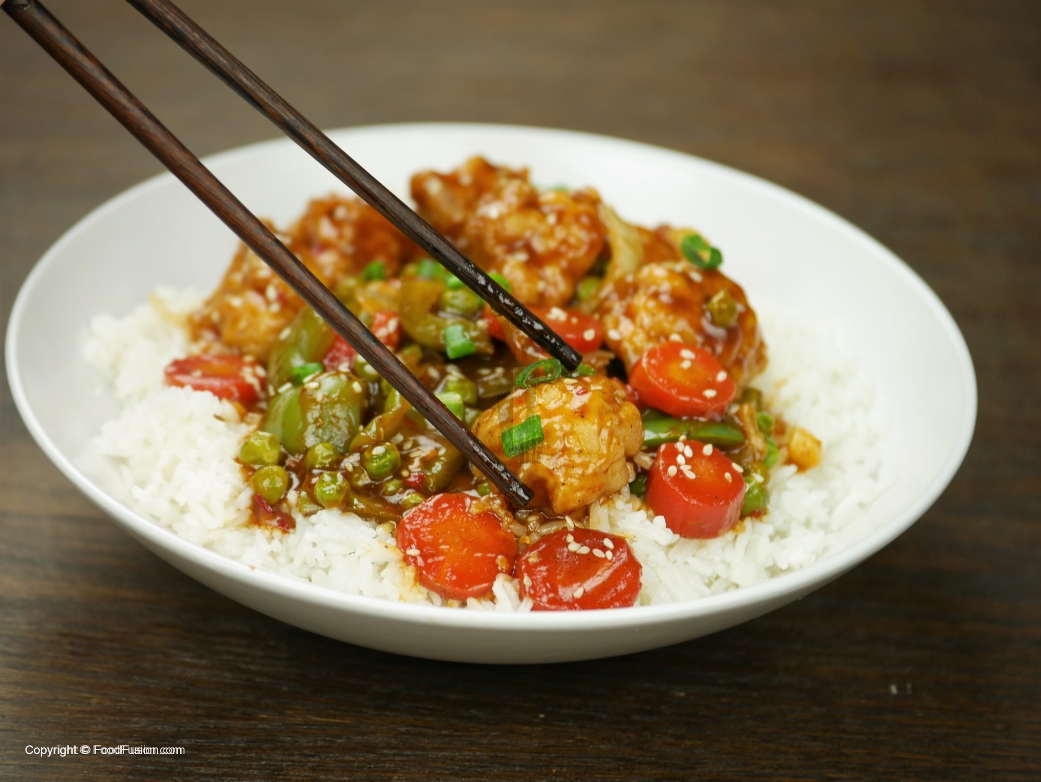 In wok,add oil and garlic (chopped) and sauté little. -Add tomato ketchup,soya sauce,worcestershire sauce,vinegar,brown sugar,red chili crushed,white pepper powder,black pepper crushed,salt and mix well. -Add chicken stock, mix it and bring it to boil. -Dissolve corn flour in water and mix well. -Add corn flour paste in gravy and give it a good mix. -Now add fried vegetables and cauliflower, mix it. -Add sesame oil and mix well. -Garnish with sesame seeds and green onion.