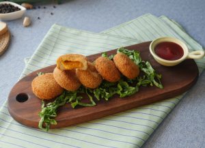 Take a mixture (10g) and make a ball,grease hands with oil,take a chicken mixture (1 tbs) and flatten on your palm,place cheese ball and cover properly with chicken mixture.