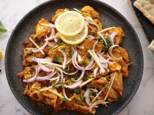-Add marinated chicken & mix well,cover & cook on low flame for 18-20 minutes then cook on high flame until it dries up & oil separates.
