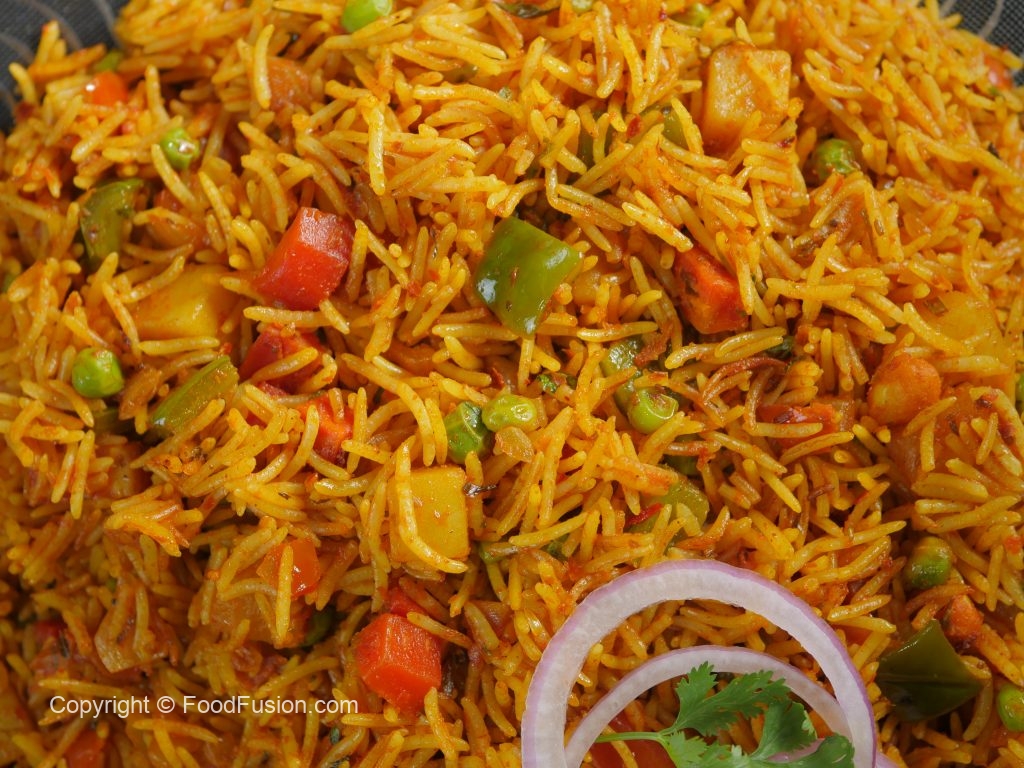 -Tawa veg pulao ko onion rings sa garnish ker lein aur zucchini dahi ka saath serve karein.