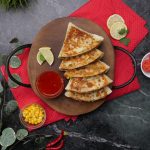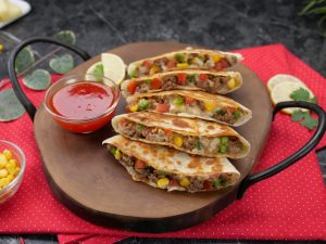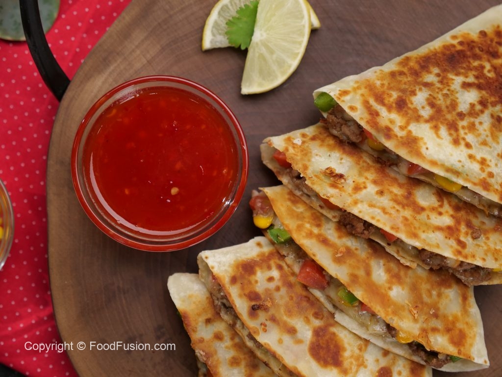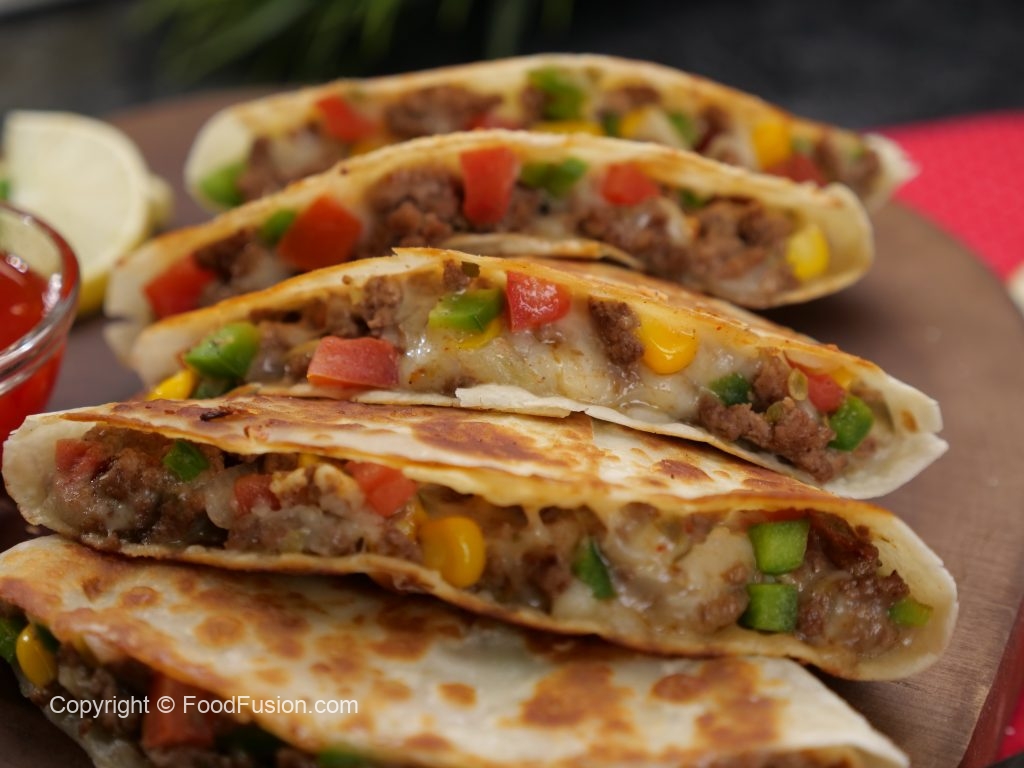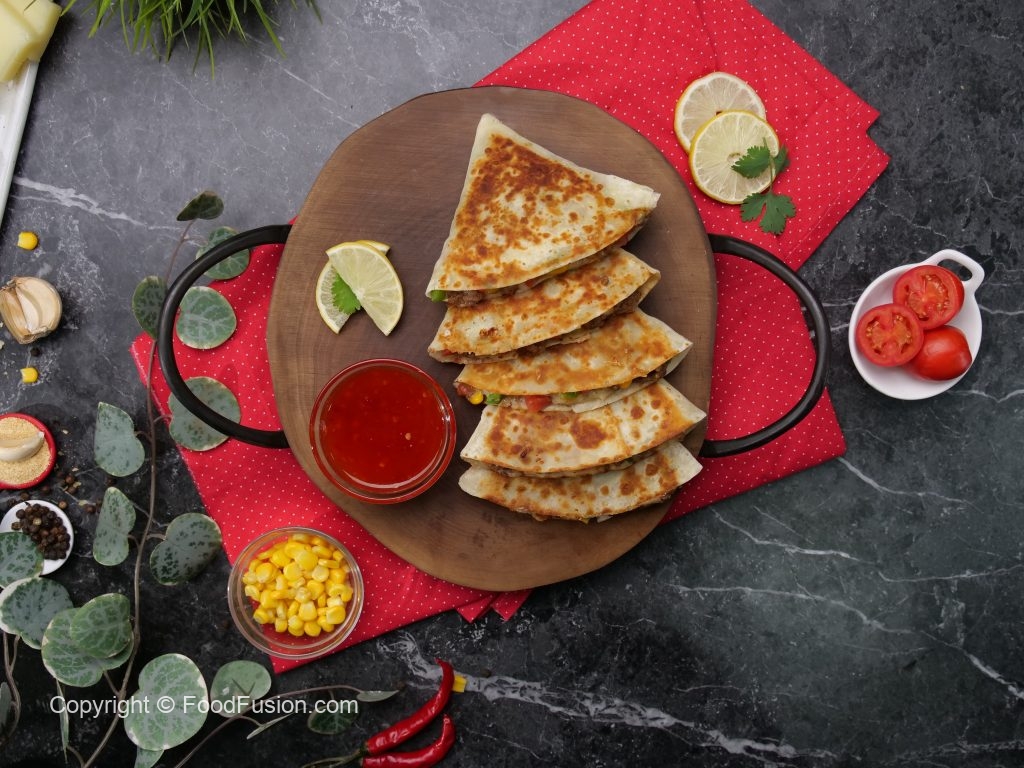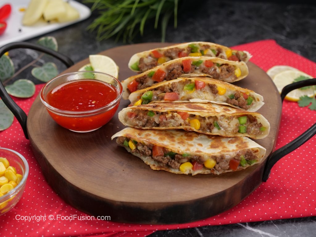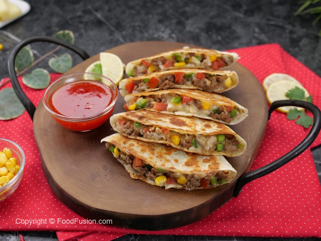 -Frying pan ko cooking oil sa grease karein aur stuffed tortillas ko dono sides sa golden-brown ho janay tak paka lein aur bech bech mein oil laga lein (makes 12 triangles quesadillas).