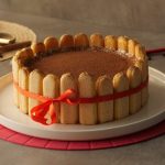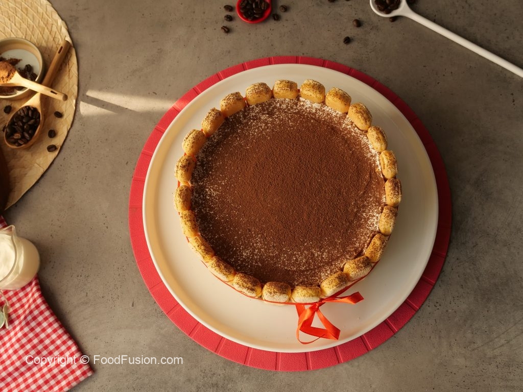Spread prepared frosting all over the cake,set ladyfinger biscuits on the sides of the cake & tie a ribbon to decorate it.
