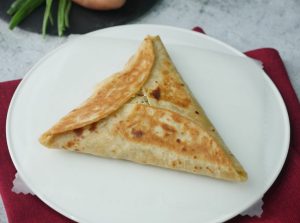 Add cheddar cheese and potato & chicken filling,fold & seal tortillas/roti to make a triangle (makes 6).
