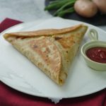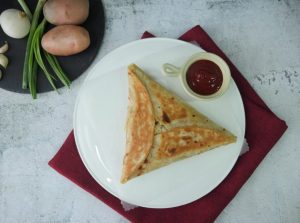 Take tortillas or roti,add potato & chicken filling and spread in triangle shape.