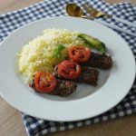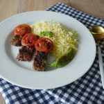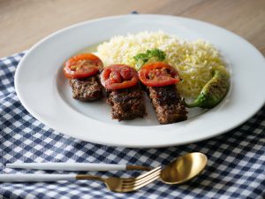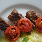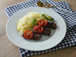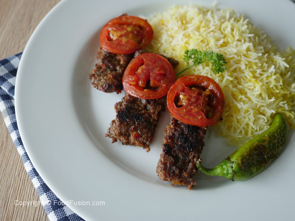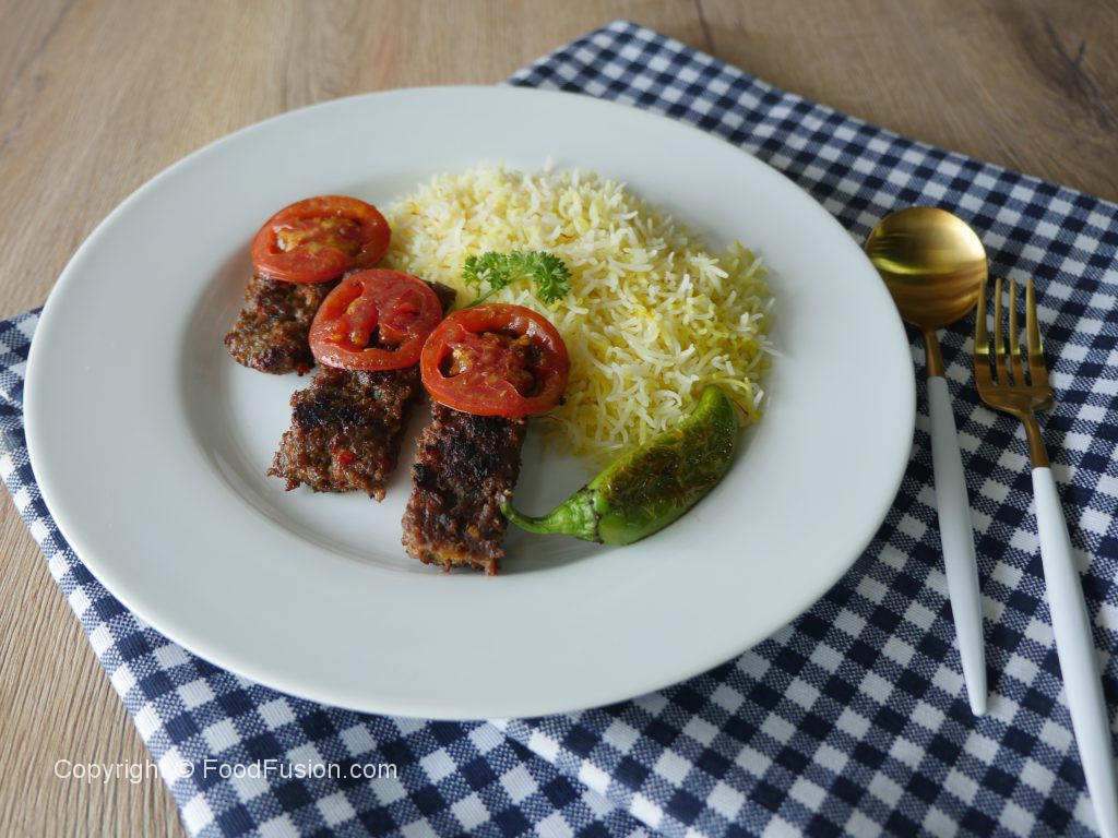 Serve Turkish kabab with rice,tomato & green chilies.