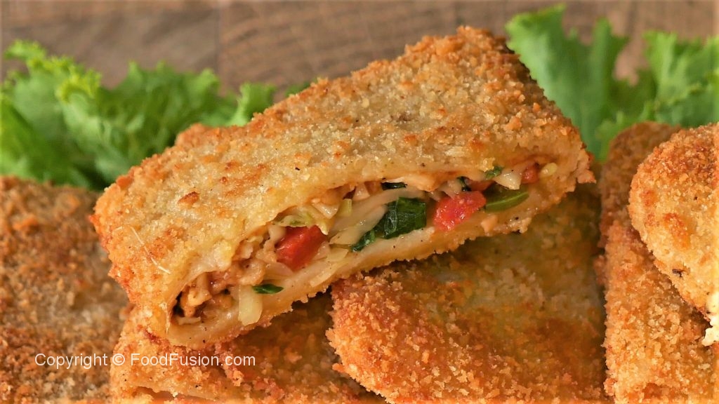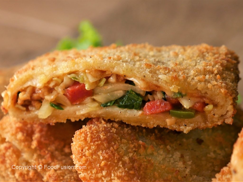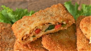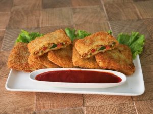 Ab tayyar box patties ko maida mein coat ker ka pheetay hoye anday mein dip ker lein phir bread crumbs mein coat ker lein phir dubara pheetay hoye anday mein dip ker ka bread crumbs mein coat ker lein.