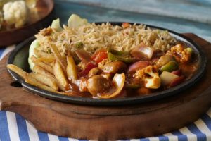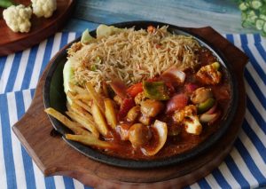 Add & spread butter,place cabbage leaves,fried rice,potato fries,stir-fried vegetable,shashlik sauce & serve!